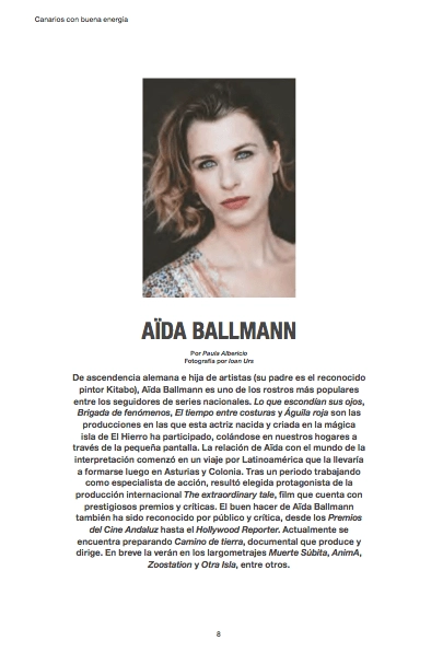 Die deutschstämmige Künstlerstochter (ihr Vater ist der bekannte Maler Kitabo) ist eines der beliebtesten Gesichter unter den Fans der nationalen Serien. Lo que escondían sus ojos, Brigada de fenómenos, El tiempo entre costuras und Águila roja sind die Produktionen, in denen die auf der magischen Insel El Hierro geborene und aufgewachsene Schauspielerin mitgespielt hat und die sich über den kleinen Bildschirm in unsere Häuser schleichen. Aïdas Beziehung zur Welt der Schauspielerei begann auf einer Reise nach Lateinamerika, die sie zu Ausbildungen in Asturien und Köln führte. (…)